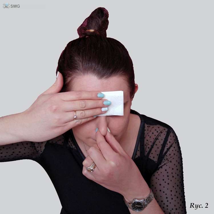 Jeżeli krwawienie jest niewielkie można je zatamować pochylając głowę do przodu i jednocześnie silnie uciskając skrzydełka nosa. W tej pozycji należy spokojnie oddychać przez usta (ryc. 1). Zalecane są zimne okłady na grzbiet nosa, czoło lub okolicę karku (ryc. 2).